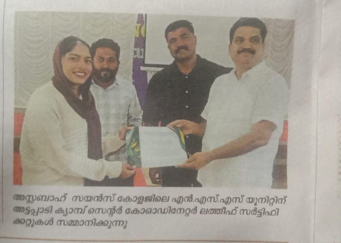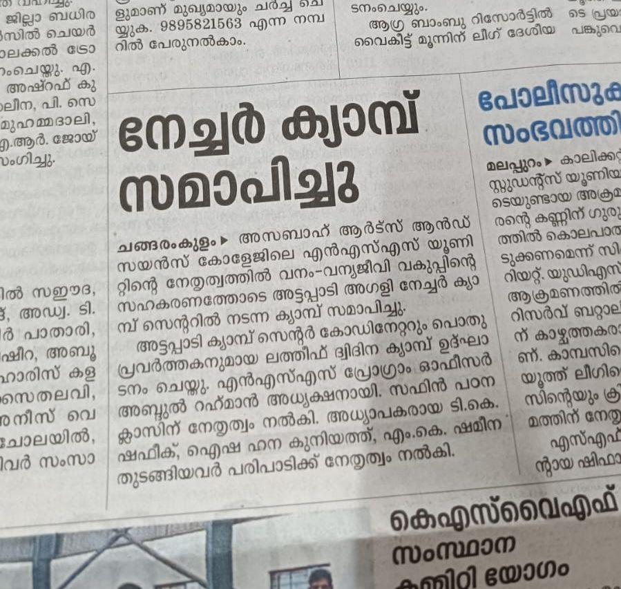 A two-day Nature Camp organized under the auspices of the NSS Unit of Assabah Arts and Science College, Valayamkulam, concluded successfully at the Nature Camp Centre, Agali Panchayat, Attappadi, on October 10 and 11, 2025. The camp aimed to provide students with an immersive experience in environmental education, tribal culture, and sustainable living practices. Organized in collaboration with the Forest and Wildlife Department, the camp offered a variety of activities combining academic learning with practical exposure. Participants took part in environmental study sessions, a visit to the Attappadi Millet Village, interactions with local communities, and trekking expeditions to Narasimukku and Sholayur, which offered a deeper understanding of the biodiversity and ecological significance of the region. The camp was inaugurated by Mr. Latheef, Coordinator of the Attappadi Camp Centre and a noted public activist, who highlighted the importance of youth involvement in environmental conservation and the need to understand the harmony between nature and indigenous life. The inaugural session was presided over by NSS Programme Officer Mr. Abdul Rahman P., who emphasized that such nature camps play a vital role in nurturing environmental awareness and leadership qualities among NSS volunteers. A special study class on “The Life and Culture of Attappadi Tribal Communities” was conducted by Mr. Safin, a social worker and researcher specializing in Attappadi tribal studies. His session provided valuable insights into the socio-economic challenges and traditional wisdom of the tribal population in the region. Faculty members Mr. Shafiq T. K., Ms. Aisha Hana Kuniyath, and Ms. Shameela M. K. actively coordinated and supervised various sessions of the camp, ensuring its smooth conduct.