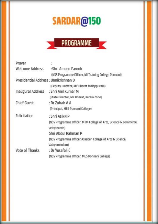 Following the march, a formal stage programme was convened to honor the legacy of the Iron Man of India. After an opening prayer, Shri Ameen Farook, the NSS Programme Officer at MI Training College, Ponnani, delivered the welcome address. The presidential address was given by Shri Unnikrishnan D, Deputy Director of MY Bharat, Malappuram, setting the tone for the session. The event was formally inaugurated by Shri Anil Kumar M, State Director of MY Bharat (Kerala Zone), while Dr. Zubair A A, Principal of MES Ponnani College, graced the occasion as the Chief Guest.